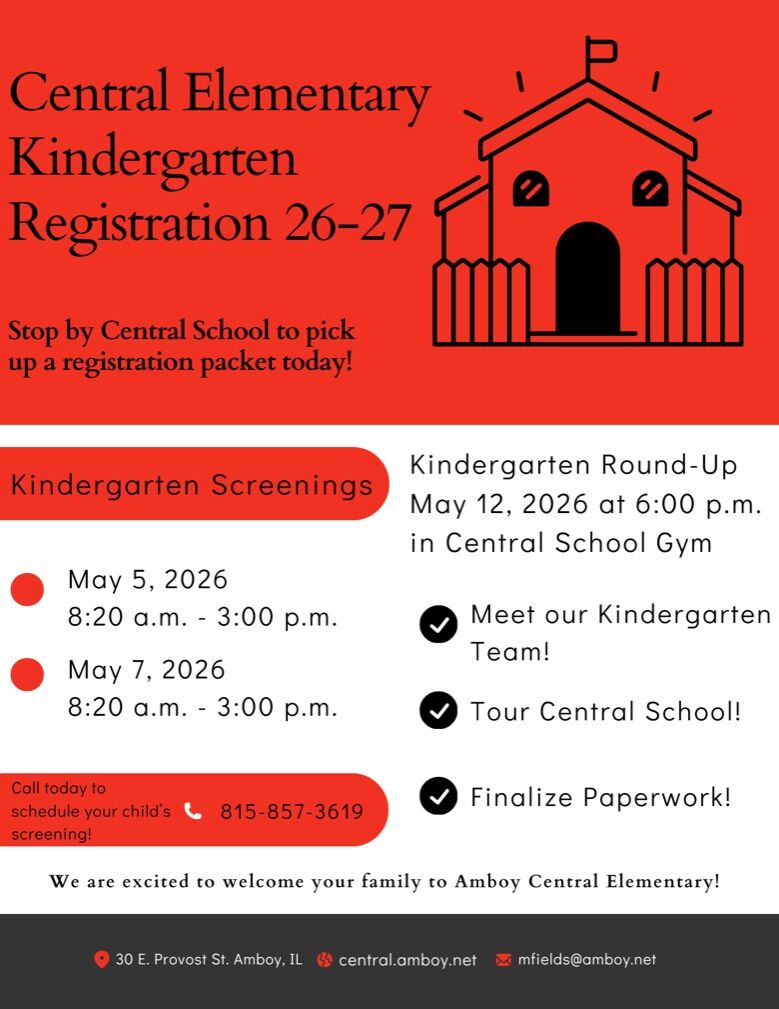 26-27 Kindergarten Preregistration Our 26-27 kindergarten preregistration is open! Please stop by Central School to pick up a registration packet and call 815-857-3619 to schedule a kindergarten screening. Save the date for our Kind...